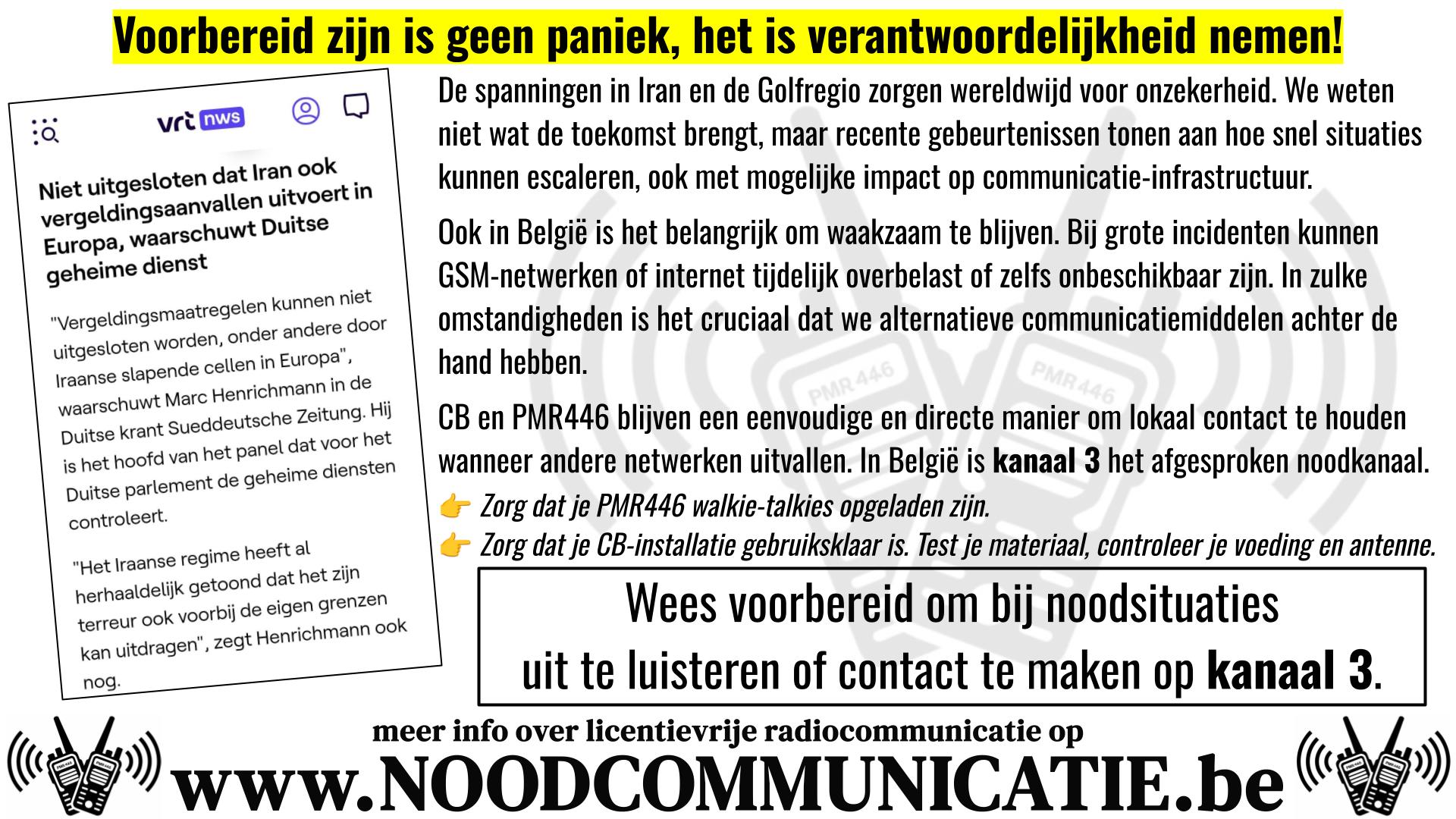 Deel deze afbeelding vandaag nog via Facebook of Instagram en laat familie en vrienden weten dat jij stand-by bent op CB en/of PMR446 kanaal 3. Hoe meer mensen voorbereid zijn, hoe sterker ons lokaal communicatienetwerk wordt wanneer het er écht toe doet.